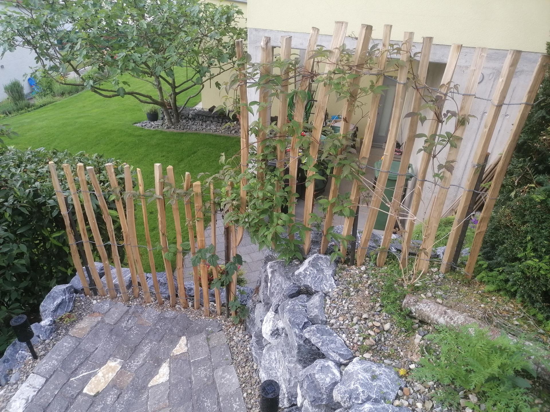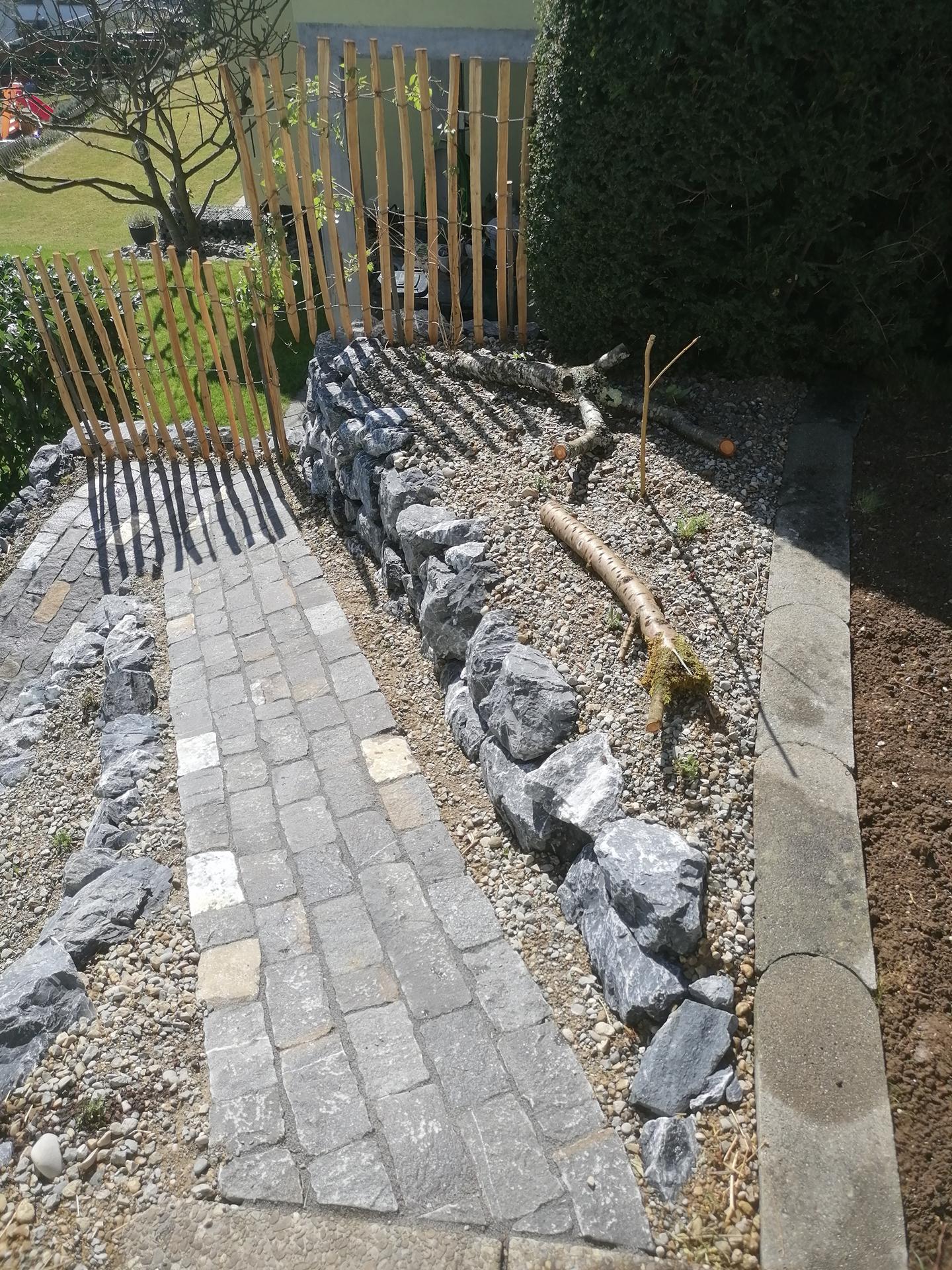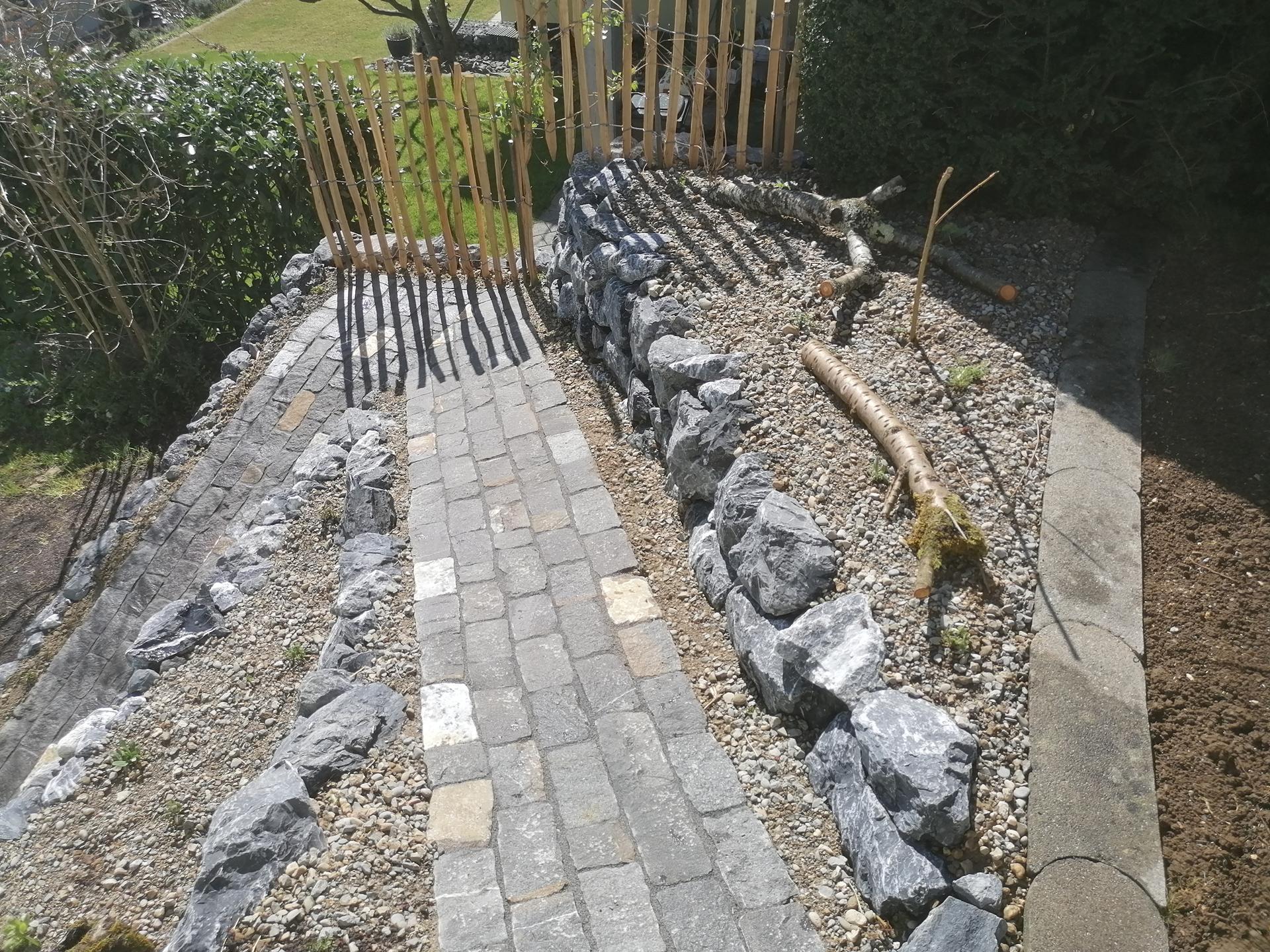 Der Gehweg wurde mit Guber Schalensteinpflästerung erstellt. Die Terrassierungen wurden mit Alpenkalk Trockenmauern im zyklopischen Verband erstellt. Ein Staketenzaun mit Clematis-Bewuchs als Absturzsicherung /Sichtschutz durfte auch nicht fehlen.
