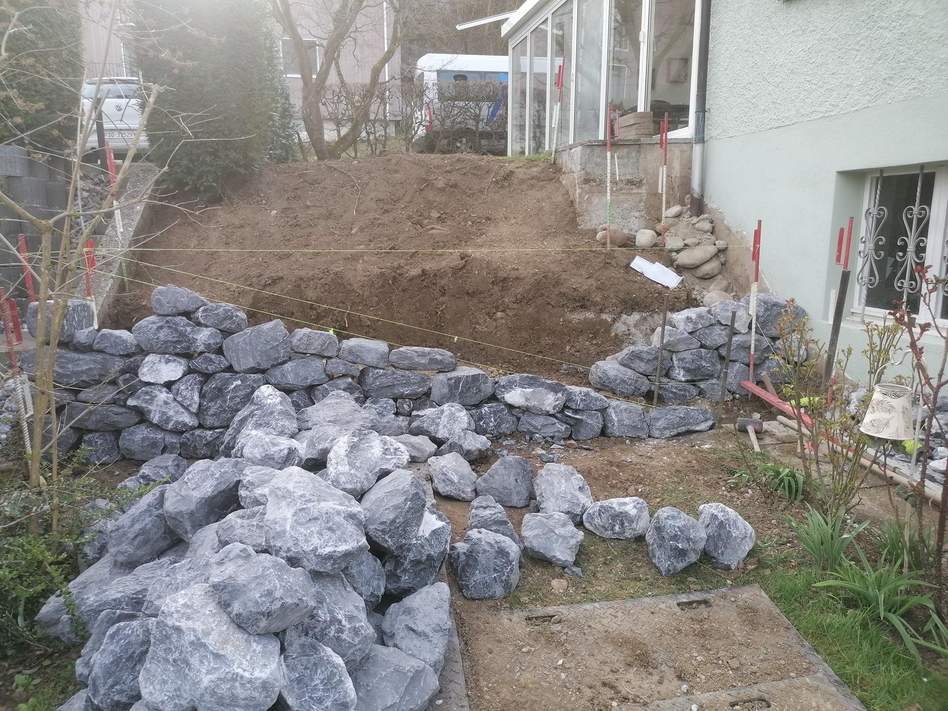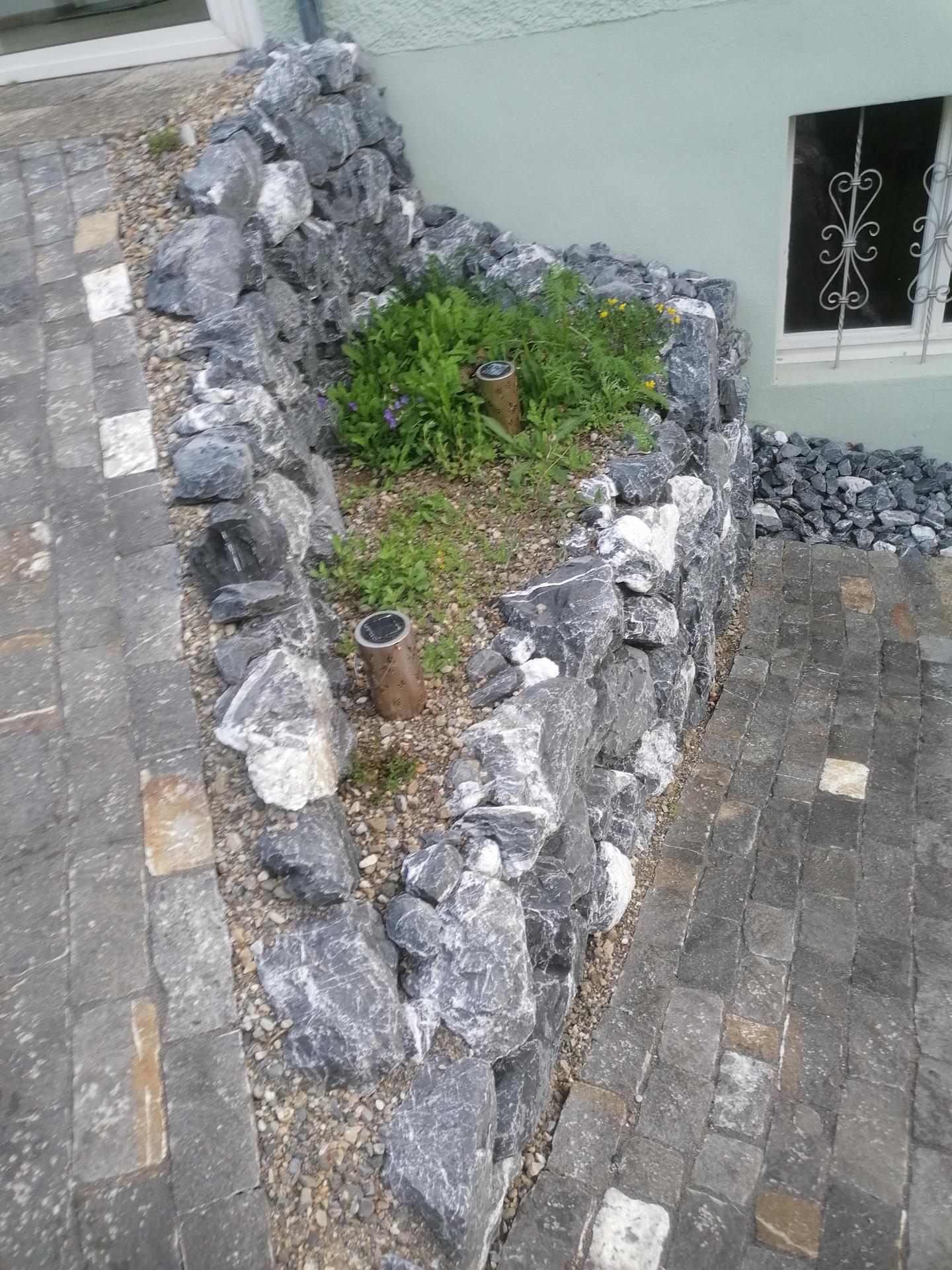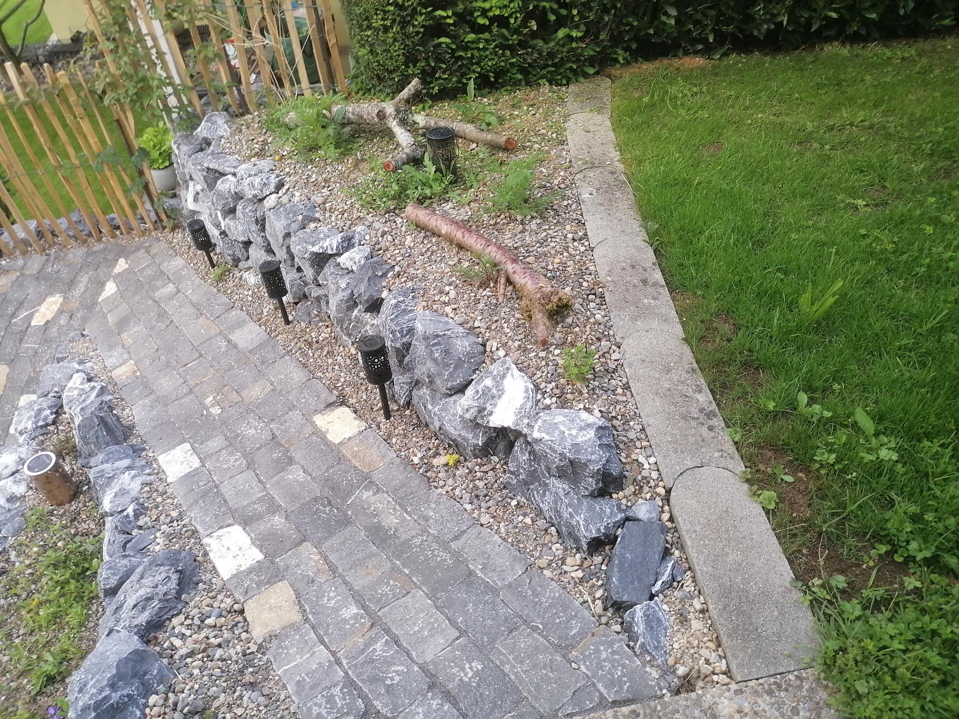 Der Gehweg wurde mit Guber Schalensteinpflästerung erstellt. Die Terrassierungen wurden mit Alpenkalk Trockenmauern im zyklopischen Verband erstellt. Ein Staketenzaun mit Clematis-Bewuchs als Absturzsicherung /Sichtschutz durfte auch nicht fehlen.