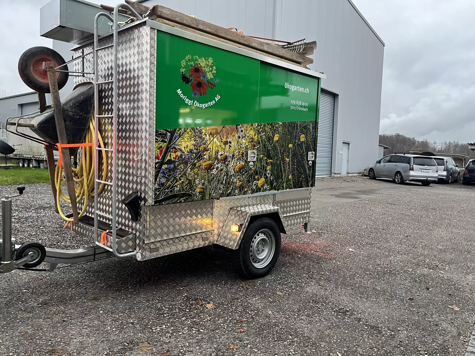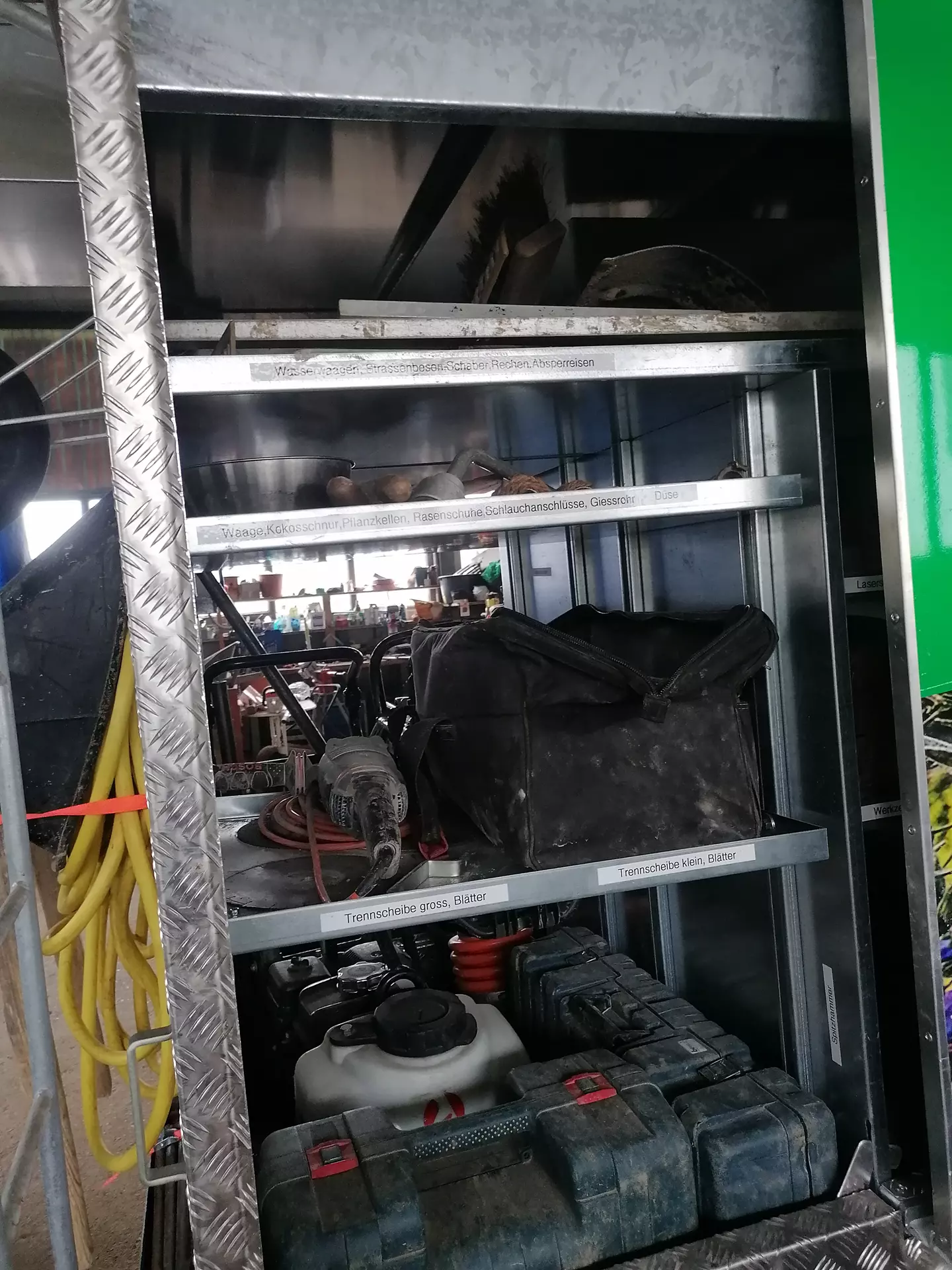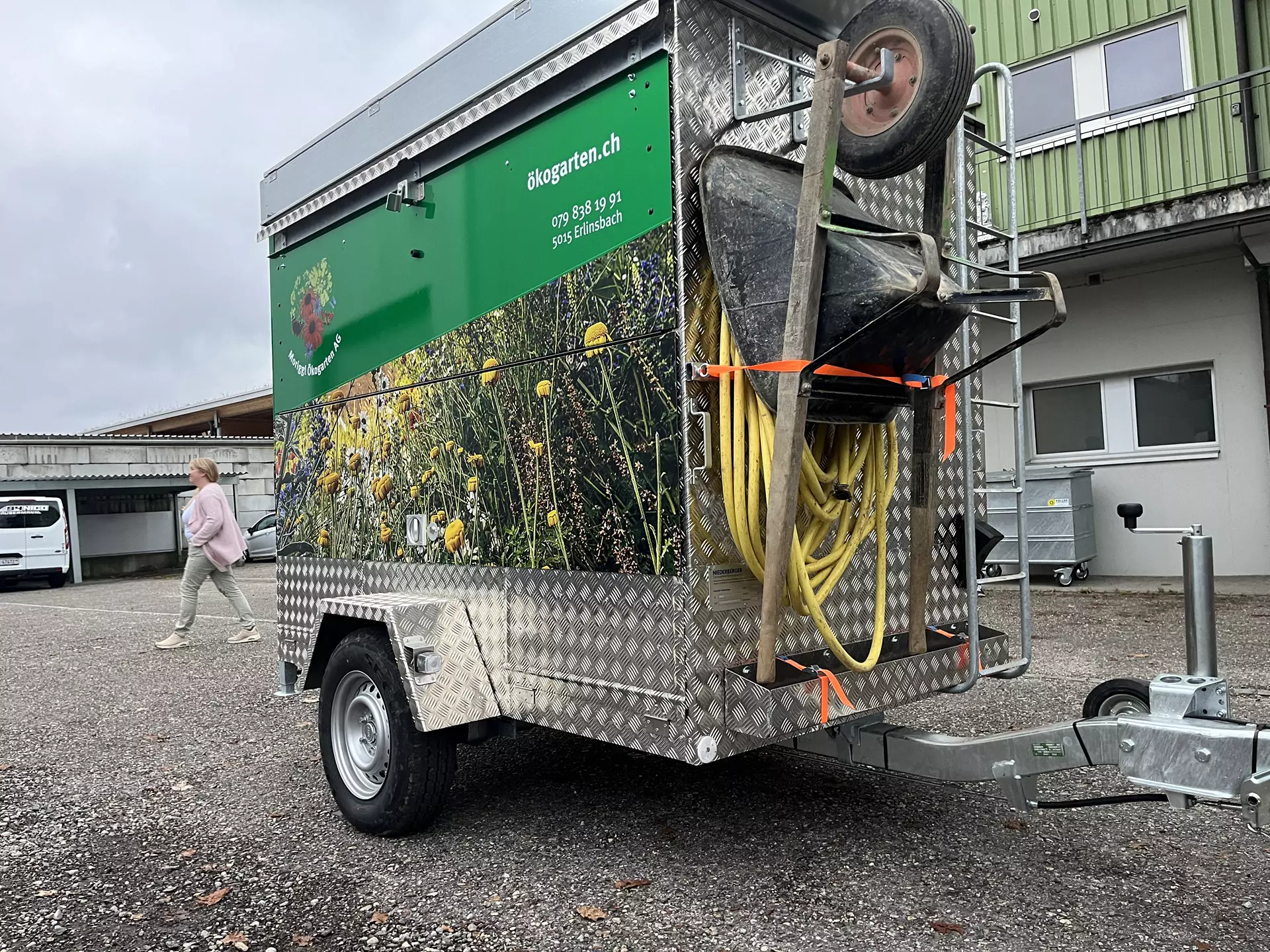 Das neue Herzstück im Betrieb. Auch für den Gartenbau ist so alles sauber in einem Werkzeuganhänger verstaut.