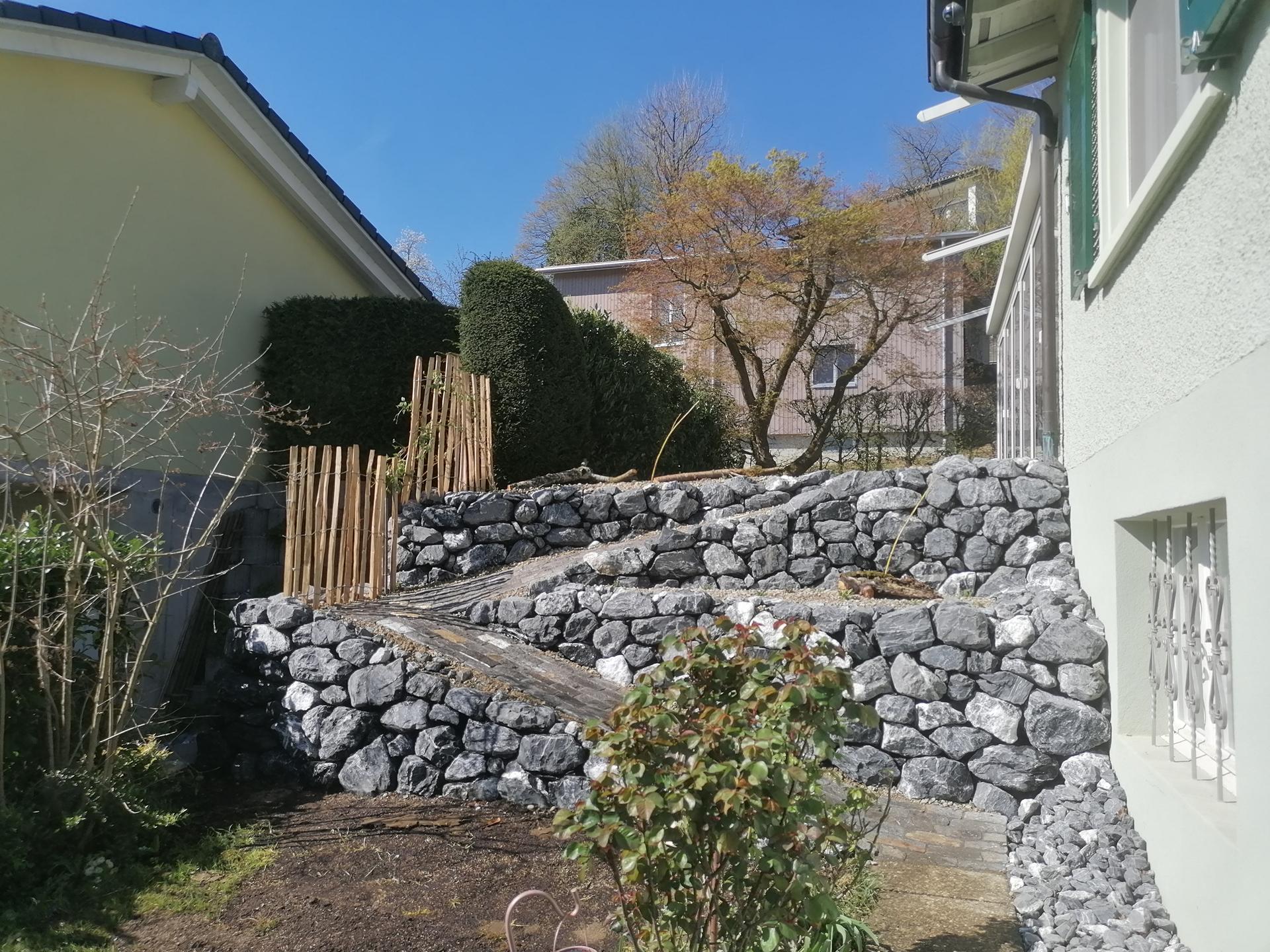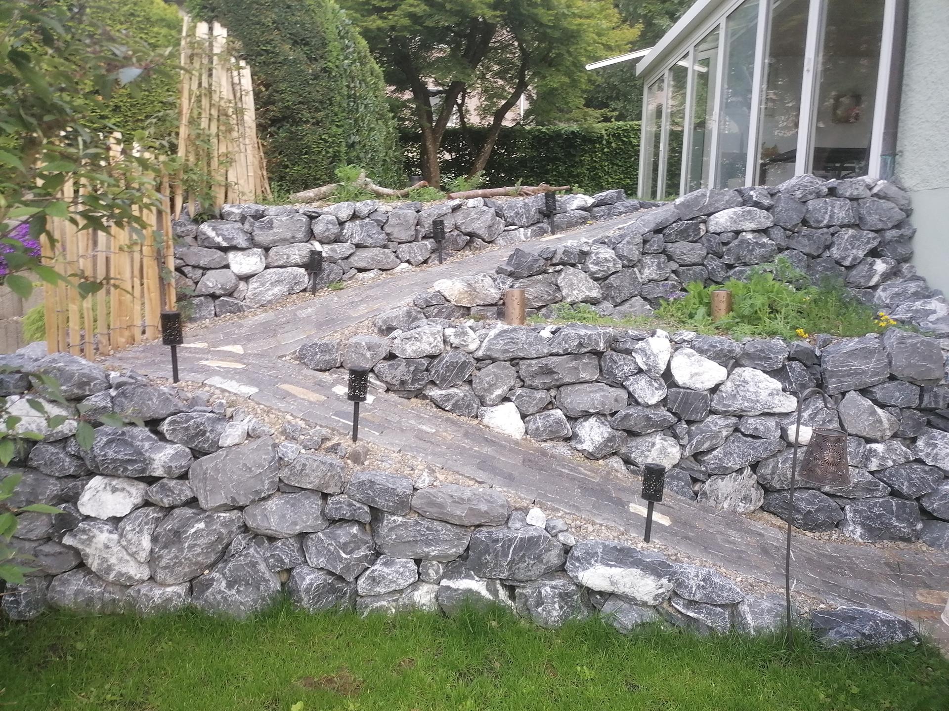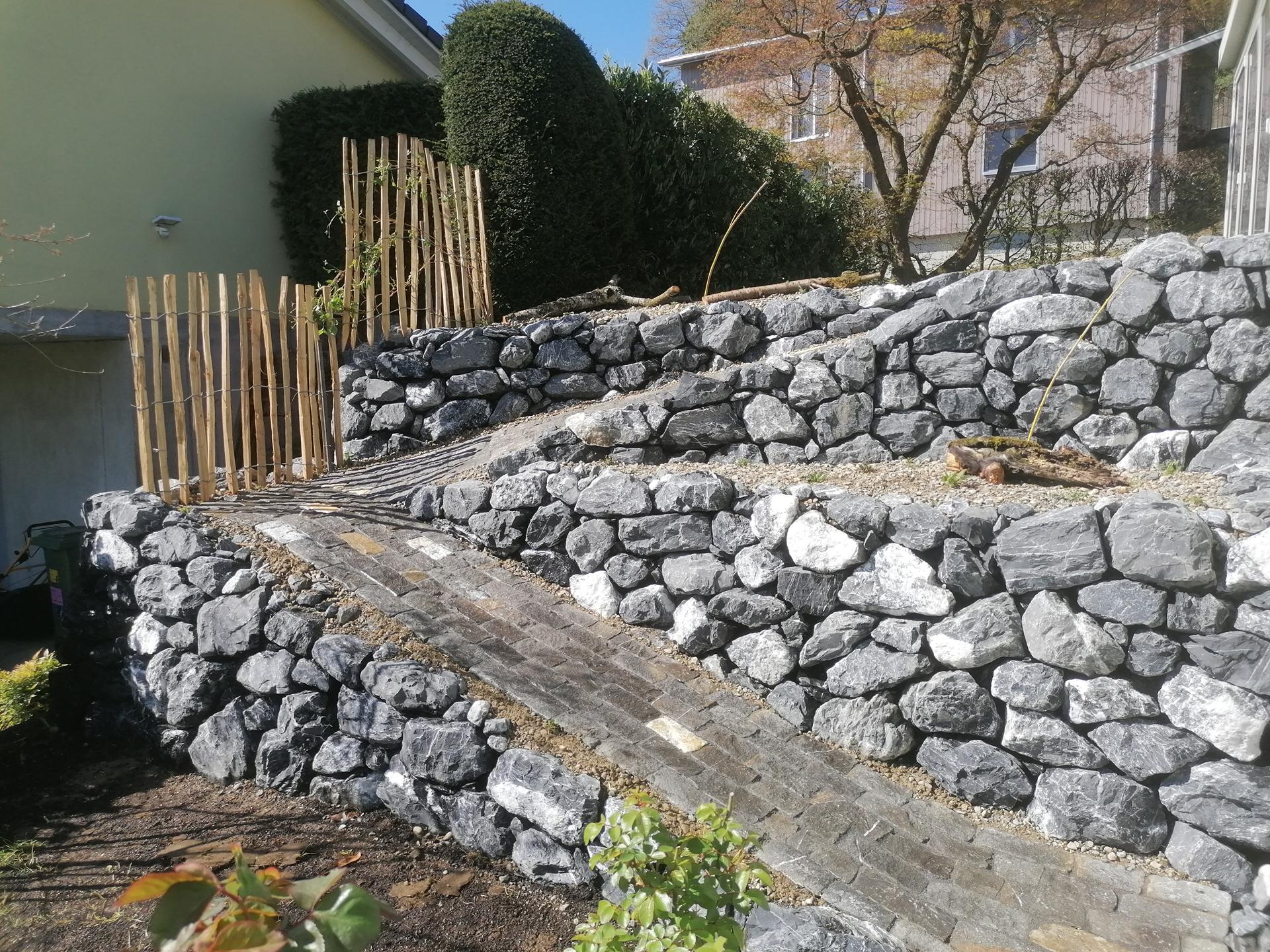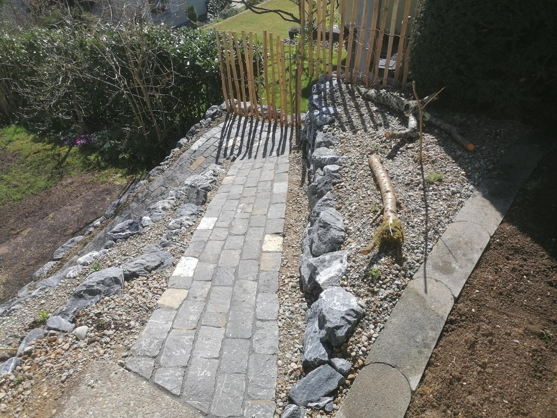 Der Gehweg wurde mit Guber Schalensteinpflästerung erstellt. Die Terrassierungen wurden mit Alpenkalk Trockenmauern im zyklopischen Verband erstellt. Ein Staketenzaun mit Clematis-Bewuchs als Absturzsicherung /Sichtschutz durfte auch nicht fehlen.